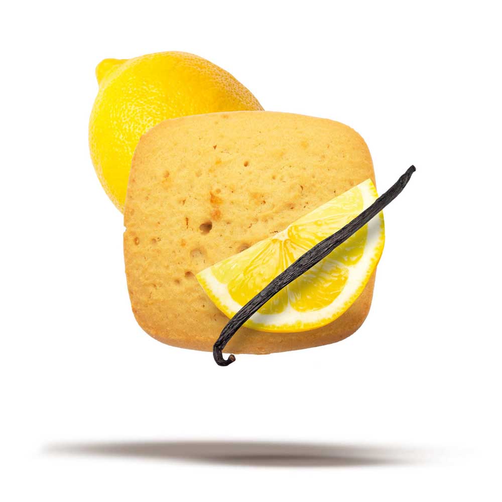 Eiwitrijke koeken met vanille- en citroen smaak, per 2 koeken (1 zakje) verpakt.