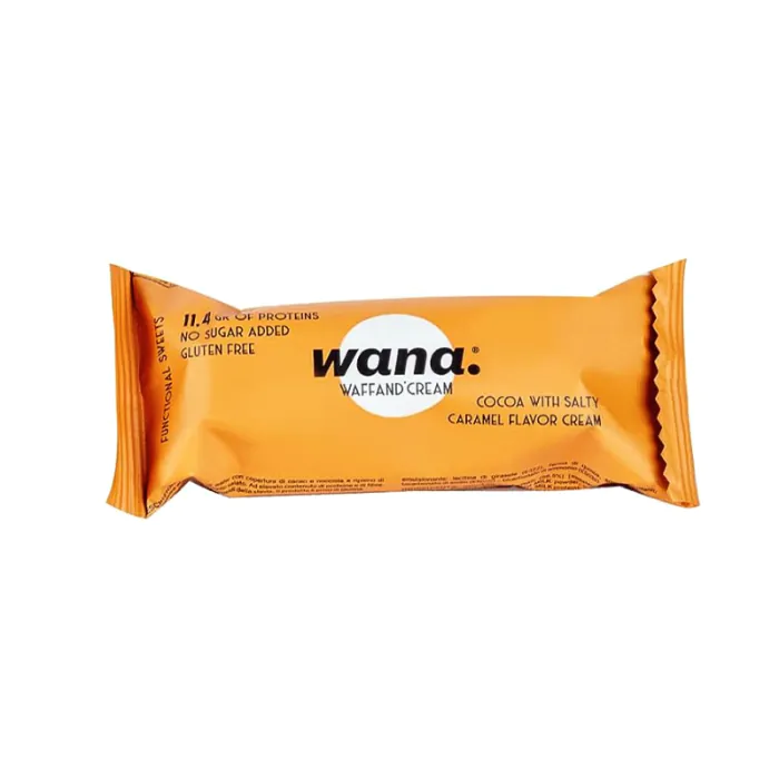 De Wana Waffand’Cream Cacao met Gezouten Karamel is een onweerstaanbare eiwitrijke snack die de perfecte balans biedt tussen smaak en voedingswaarde. Deze glutenvrije reep bestaat uit knapperige wafellaagjes gevuld met een rijke gezouten karamelcrème en omhuld met een laagje romige cacaoboter. Met 11,4 g eiwit per reep en zonder toegevoegde suikers is het de ideale keuze voor een verantwoorde traktatie.