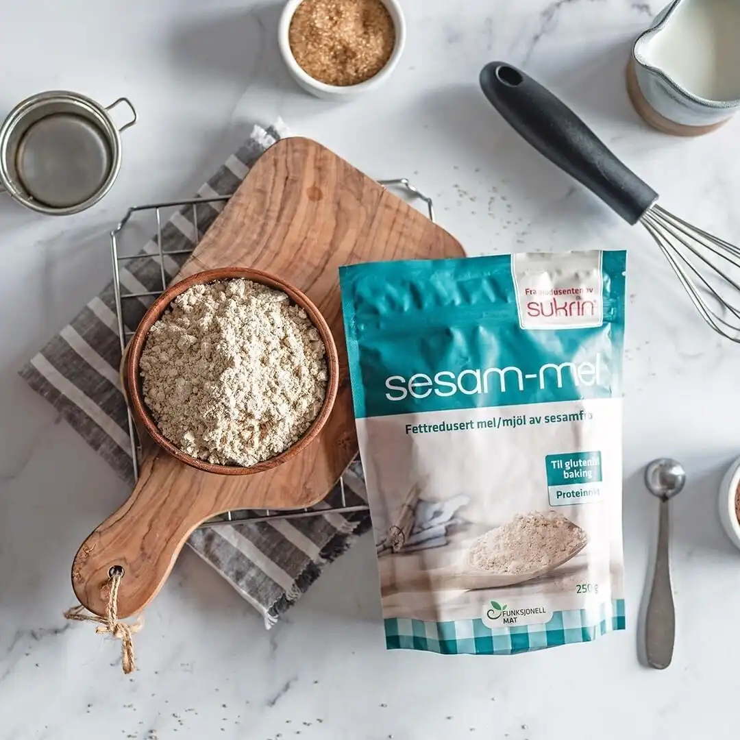 Sesammeel is koolhydraat-arm, daarom is het een geweldig ingrediënt voor een koolhydraat-arme levensstijl. Je kunt het in talloze recepten gebruiken om de hoeveelheid koolhydraten in te perken. Bovendien bevat het van nature 46% pure proteïne. Dat maakt sesammeel een heerlijke en voedzame toevoeging aan je dieet. Sukrin sesammeel bevat maar 1/3 van het vet van gewoon sesamzaad. Daarom is het het perfecte ingrediënt voor ‘light’ koken en bakken.