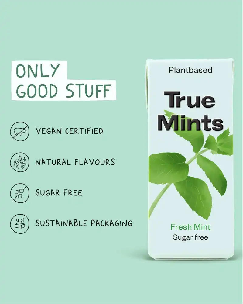 Suikervrije, plantaardige pastilles in diverse smaken, met zoetstoffen. True Mints vermijdt al deze ingrediënten – je krijgt alleen wat je wil: lekkere smaak, zonder concessies.